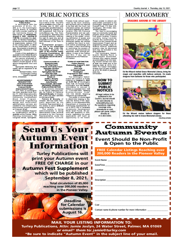 Page 12Country Journal Thursday, July 15, 2021PUBLIC NOTICES Cumming ton CBA Hearing Public Notice In accordance with the provisions of M.G.L. Ch. 40A, 11, the Cumming ton Zoning Board of Appeals