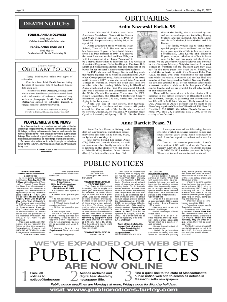 Page 14Country Journal Thursday, May 21, 2020OBITUARIESDEATH NOTICES Anita Wazowski Forms, 95FORISH, ANITA WAZOWSKI Died May 16 Celebration of Life at a later database, ANNE BARTLETT Died May 14 Celebration