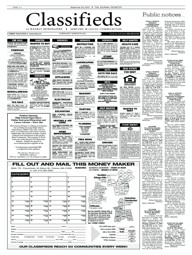 PAGE 14September 29, 2022 THE JOURNAL REGISTERClassifieds 1 4 W E E K LY N EW SPA P E R SSE RV I N G 5 0 LO C A L C OM M U N I T I ES COMMUNITY MARKETPLACE TURKEY PUBLICATION www.turley.comSERVICES