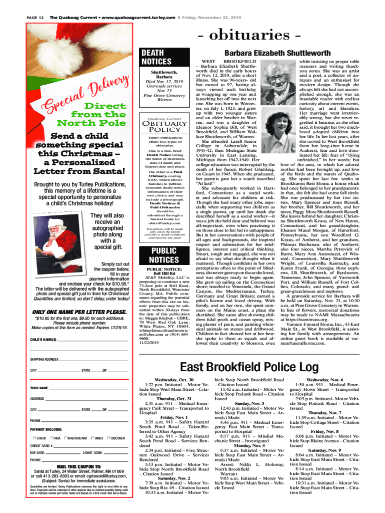 PAGE 1 2The Quahog Current www.quaboagcurrent.turley.com I Friday, November 22, 2019, obituaries DEATH NOTICESDirect from the North Pole Send a child something special this Christmas a Personalized