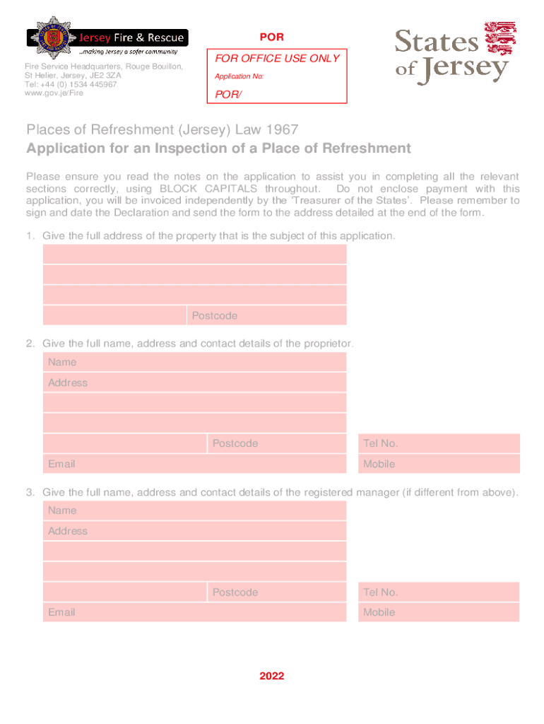 POR Fire Service Headquarters, Rouge Bouillon, St Helper, Jersey, JE2 3ZA Tel: +44 (0) 1534 445967 www.gov.je/FireFOR OFFICE USE ONLY Application No:POR/Places of Refreshment (Jersey) Law 1967 Application