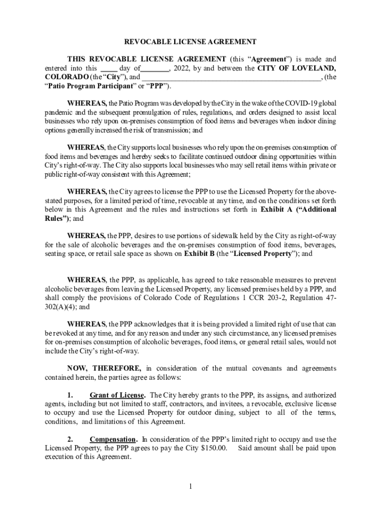 REVOCABLE LICENSE AGREEMENT THIS REVOCABLE LICENSE AGREEMENT (this Agreement) is made and entered into this day of, 2022, by and between the CITY OF LOVELAND, COLORADO (the City), and ___, (the Patio