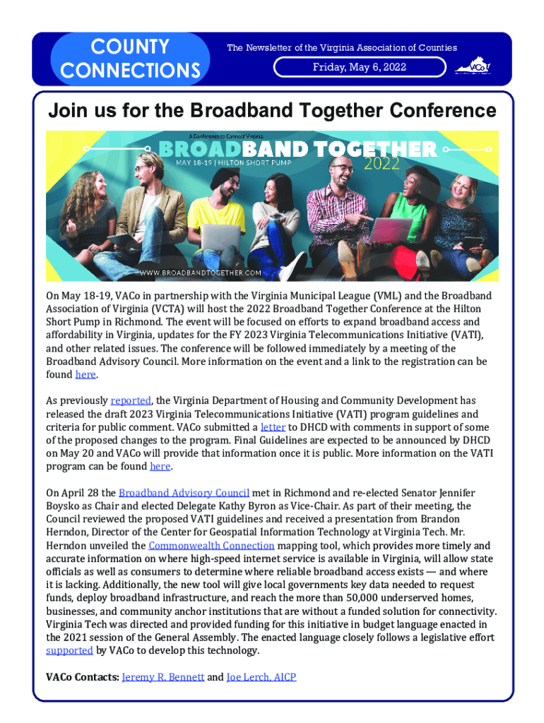 COUNTY Connections Newsletter of the Virginia Association of Counties Friday, May 6, 2022Join us for the Broadband Together Conference May 1819, Waco in partnership with the Virginia Municipal League