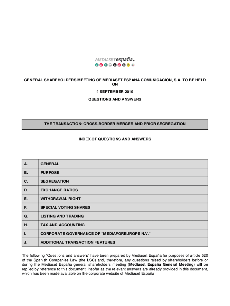 GENERAL SHAREHOLDERS MEETING OF MEDIA SET ESAA COMMUNICATION, S.A. TO BE HELD ON 4 SEPTEMBER 2019 QUESTIONS AND ANSWERS TRANSACTION: CROSSOVER MERGER AND PRIOR SEGREGATIONINDEX OF QUESTIONS AND ANSWERS.GENERAL.PURPOSE.SEGREGATION.EXCHANGE