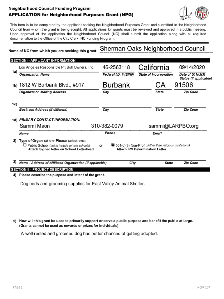 Neighborhood Council Funding Program APPLICATION for Neighborhood Purposes Grant (NPG) This form is to be completed by the applicant seeking the Neighborhood Purposes Grant and submitted to the Neighborhood