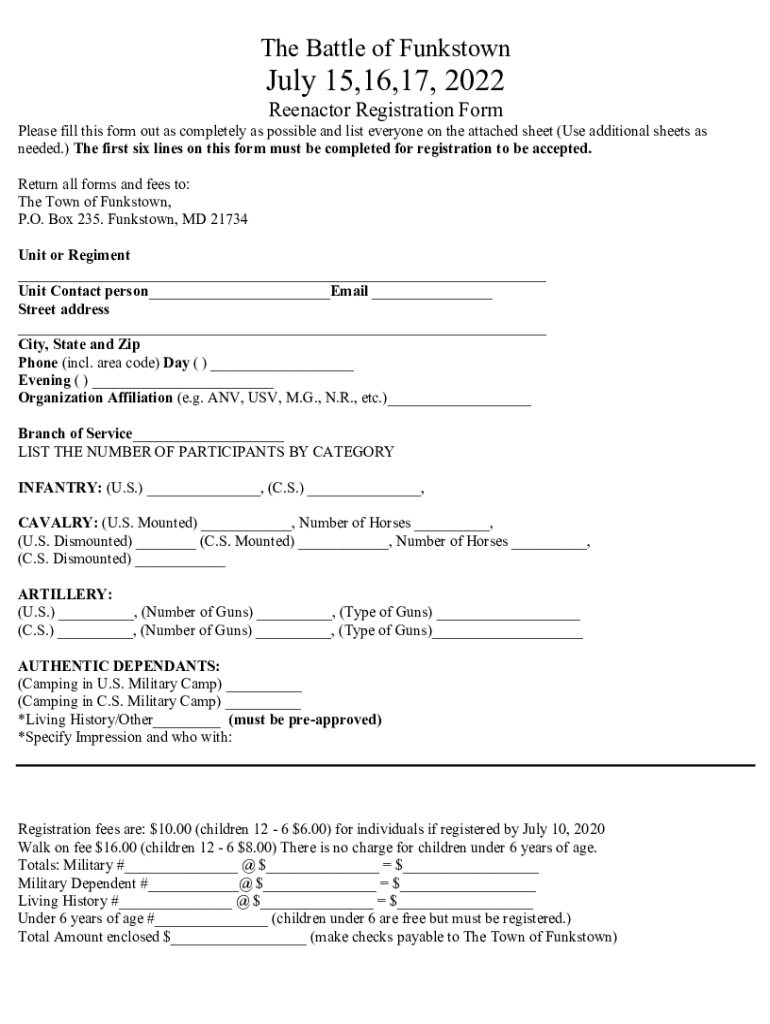 The Battle of FunkstownJuly 15,16,17, 2022 Reenact or Registration Form Please fill this form out as completely as possible and list everyone on the attached sheet (Use additional sheets as needed.)