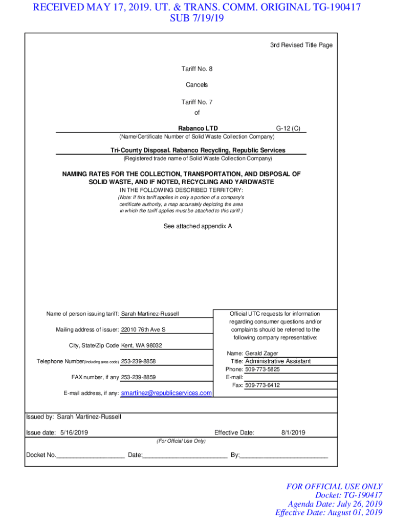 RECEIVED MAY 17, 2019. UT. & TRANS. COMM. ORIGINAL TG190417 SUB 7/19/19 3rd Revised Title PageTariff No. 8 Cancels Tariff No. 7 of Tabasco LTDG12 (C)(Name/Certificate Number of Solid Waste Collection