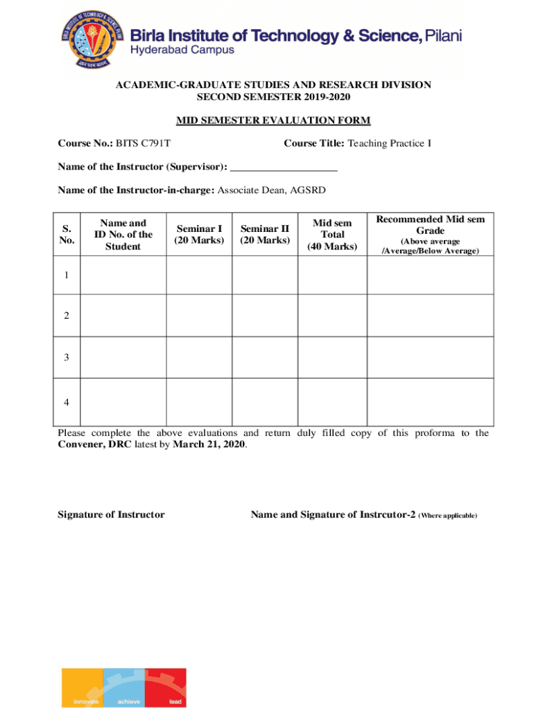 Course No.: BITS C791TCourse Title: Teaching Practice Name of the Instructor (Supervisor): ___