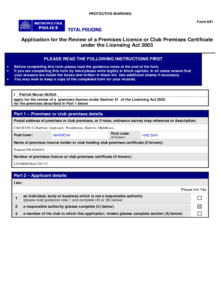 PROTECTIVE MARKING Form 691Application for the Review of a Premises License or Club Premises Certificate under the Licensing Act 2003 PLEASE READ THE FOLLOWING INSTRUCTIONS FIRST Before completing