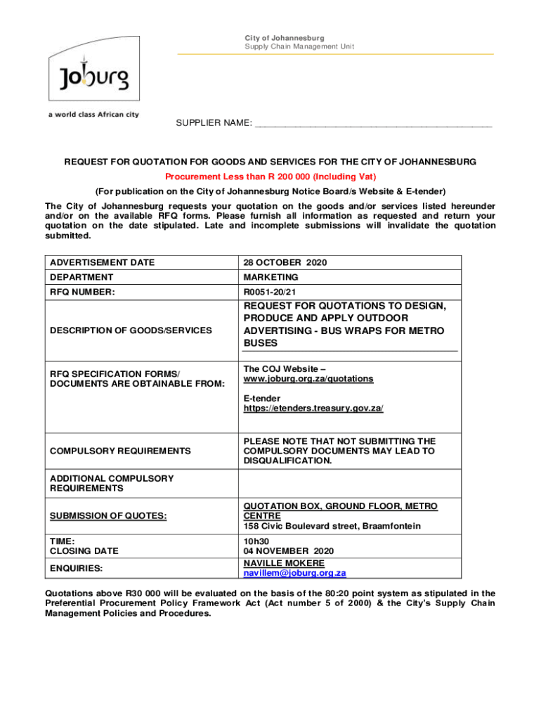 Supply Chain Management UnitSUPPLIER NAME: ___REQUEST FOR QUOTATION FOR GOODS AND SERVICES FOR THE CITY OF JOHANNESBURG