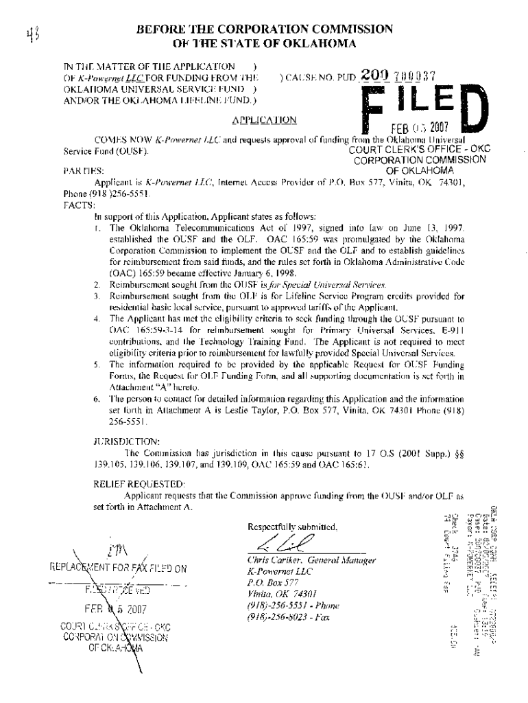BEFORE THE CORPORATION COMMISSION OF THE STATE OF OKLAHOMA IN THE MATTER OF THE APPLICATION) FOR FUNDING FROM THE) CAUSE NO. PUD 209 r1 0 0 0 3 7 OF Powered LLC OKLAHOMA UNIVERSAL SERVICE FUND) AND/OR