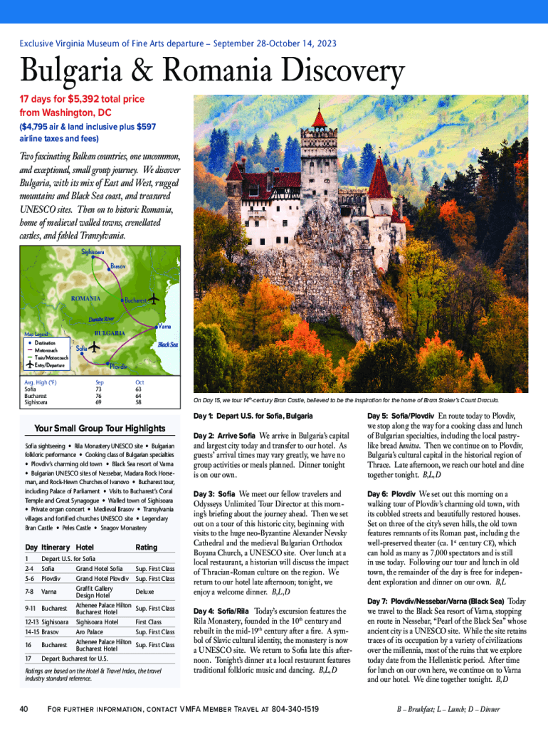 Exclusive Virginia Museum of Fine Arts departure September 28October 14, 2023Bulgaria & Romania Discovery 17 days for $5,392 total price from Washington, DC ($4,795 air & land inclusive plus $597