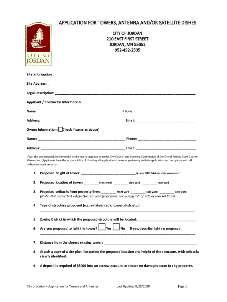APPLICATION FOR TOWERS, ANTENNA AND/OR SATELLITE DISHES CITY OF JORDAN 210 EAST FIRST STREET JORDAN, MN 55352 9524922535Site Information Site Address: ___ Legal Description: ___ Applicant / Contractor