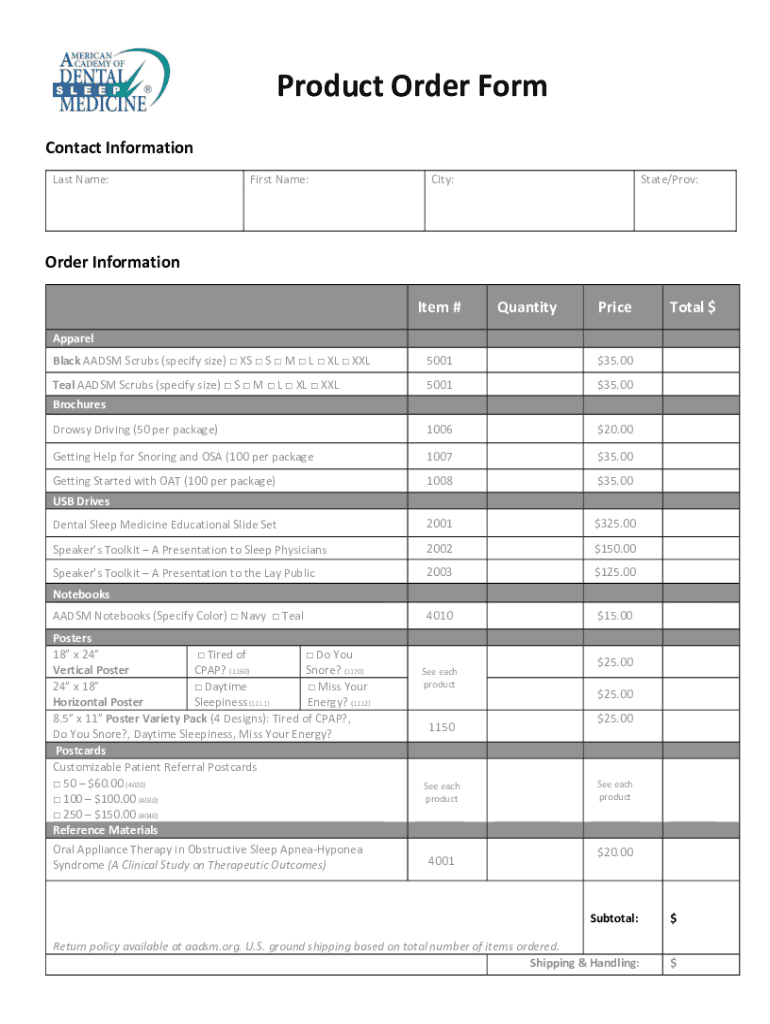 Product Order Form Contact Information Last Name:First Name:City:State/Prov:Order Information Item #QuantityPriceTotal appeal Black AA DSM Scrubs (specify size) XS S M L XL XXL$500135.00Teal AA DSM