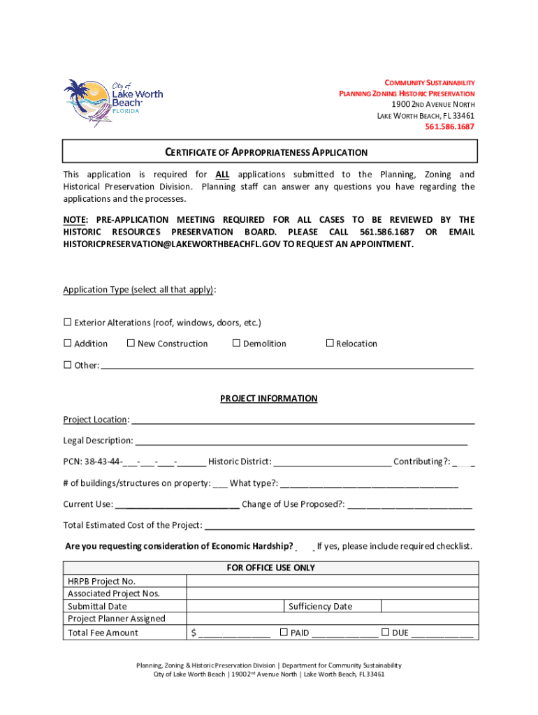 COMMUNITY SUSTAINABILITY PLANNING ZONING HISTORIC PRESERVATION 1900 2ND AVENUE NORTH LAKE WORTH BEACH, FL 33461 561.586.1687CERTIFICATE OF APPROPRIATENESS APPLICATION This application is required