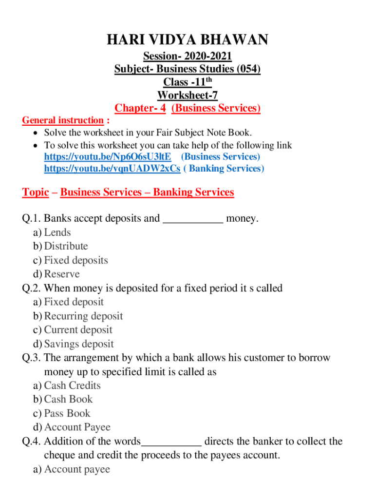 HARD VIDA SHAWN Session 20202021 Subject Business Studies (054) Class 11th Worksheet7 Chapter 4 (Business Services) General instruction : Solve the worksheet in your Fair Subject Note Book. To solve