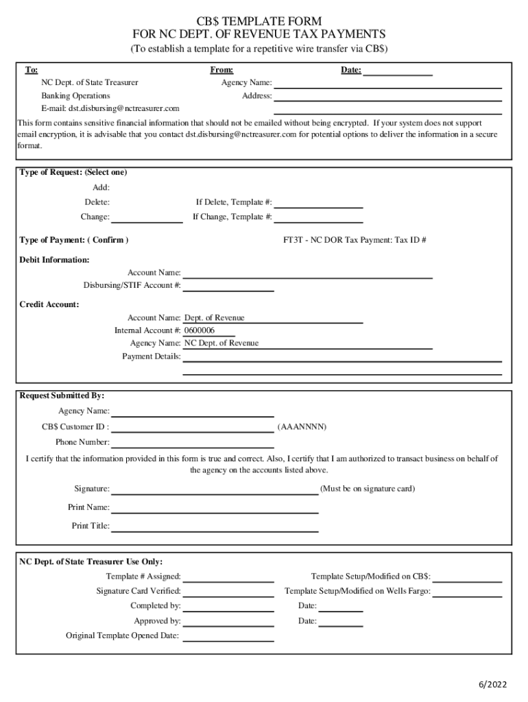 CBC TEMPLATE FORM FOR NC DEPT. OF REVENUE TAX PAYMENTS (To establish a template for a repetitive wire transfer via CBC) To: NC Dept. of State Treasurer Banking Operations Email: dst.disbursing@nctreasurer.comFrom: