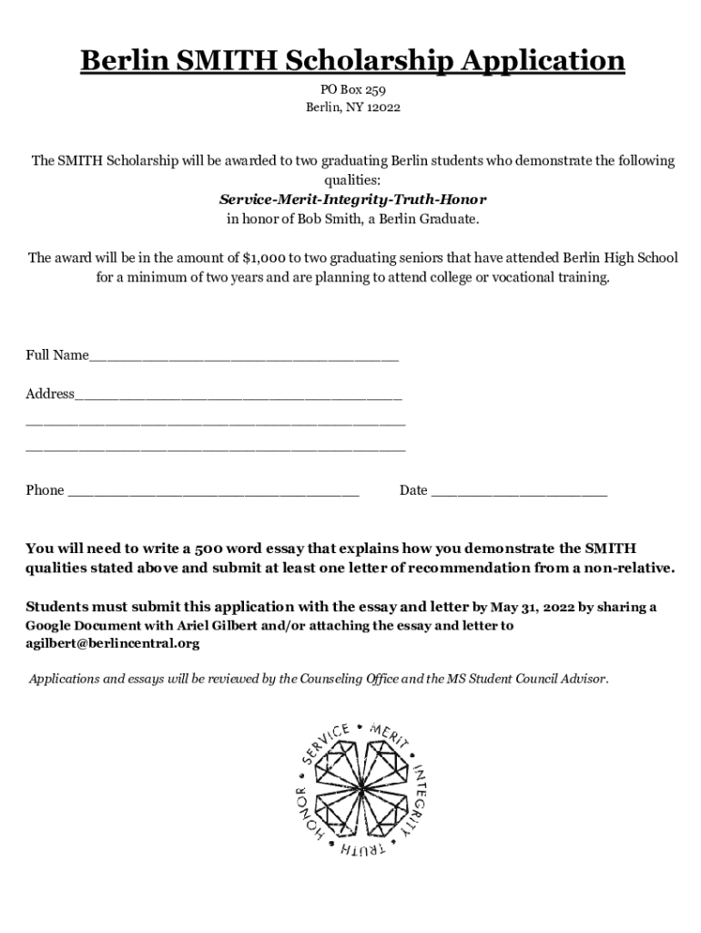 Berlin SMITH Scholarship Application PO Box 259 Berlin, NY 12022The SMITH Scholarship will be awarded to two graduating from Berlin students who demonstrate the following qualities: ServiceMeritIntegrityTruthHonor