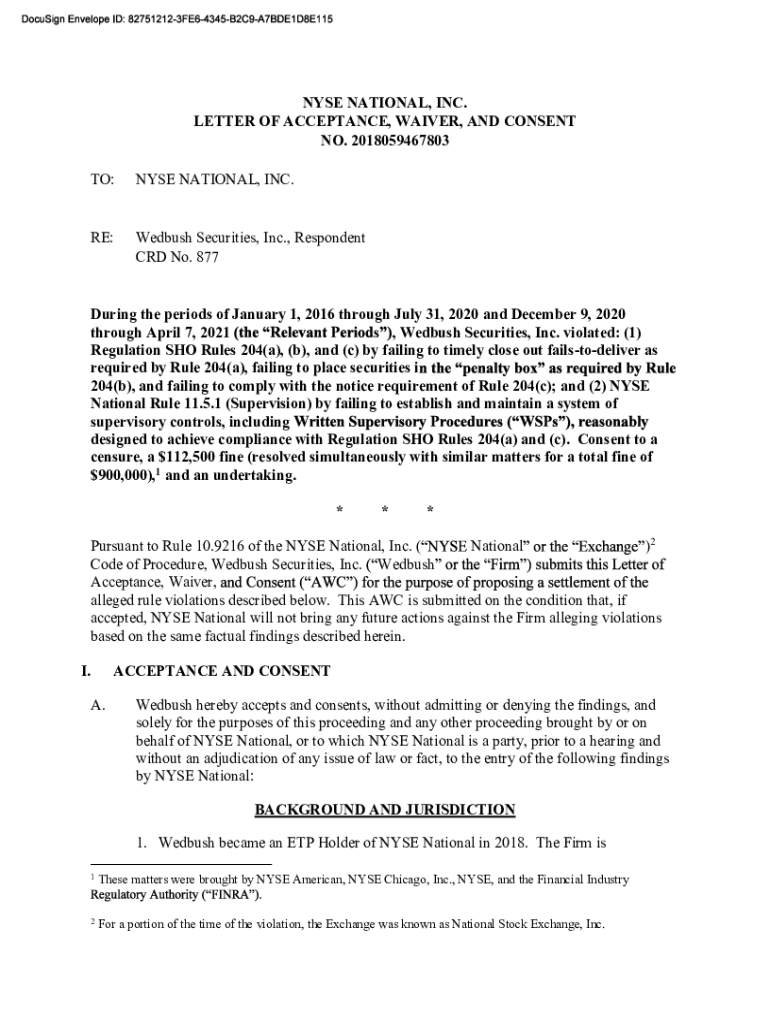 TO:NYSE NATIONAL, INC.RE:Wedbush Securities, Inc., Respondent
