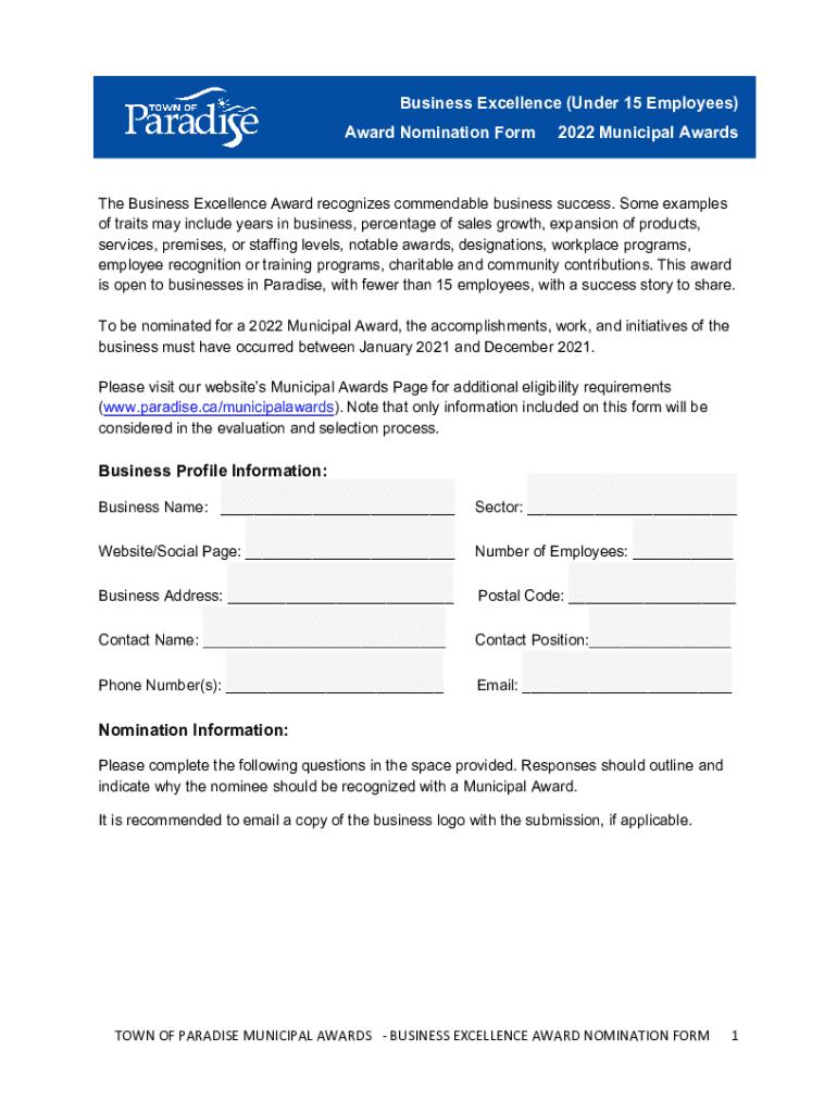 Business Excellence (Under 15 Employees) Award Nomination Form2022 Municipal Awards Business Excellence Award recognizes commendable business success. Some examples of traits may include years in
