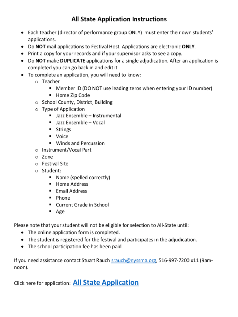 Get the free NYSSMA All-State Application Instructions