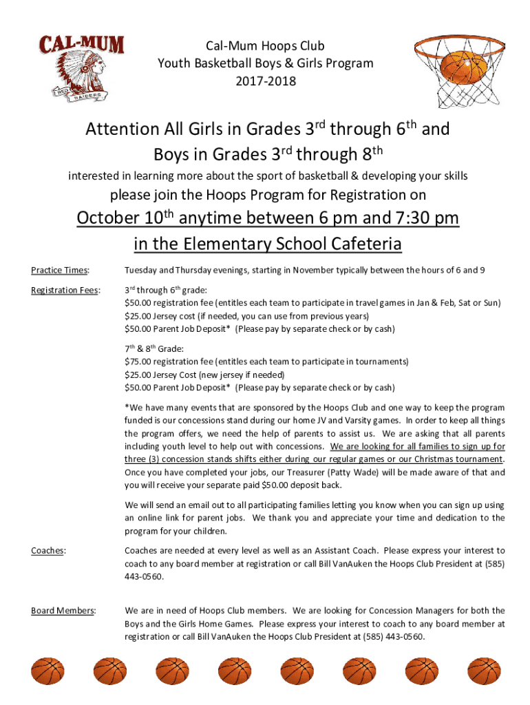 Callum Hoops Club Youth Basketball Boys & Girls Program 20172018Attention All Girls in Grades 3rd through 6th and Boys in Grades 3rd through 8th interested in learning more about the sport of basketball
