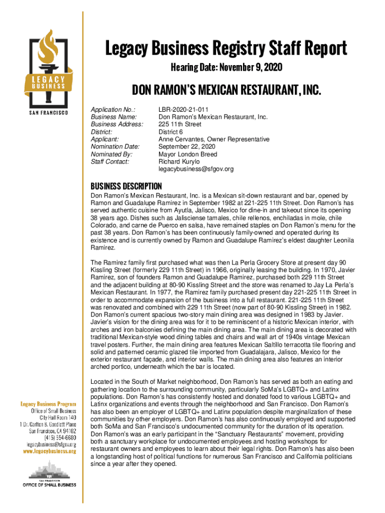 Legacy Business Registry Staff Report Hearing Date: November 9, 2020DON RAMON MEXICAN RESTAURANT, INC. Application No.: Business Name: Business Address: District: Applicant: Nomination Date: Nominated
