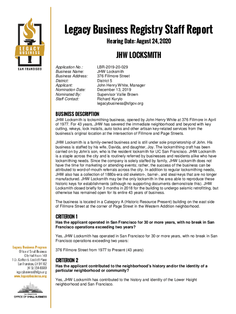 Legacy Business Registry Staff Report Hearing Date: August 24, 2020JHW LOCKSMITH Application No.: Business Name: Business Address: District: Applicant: Nomination Date: Nominated By: Staff Contact:LBR201920029