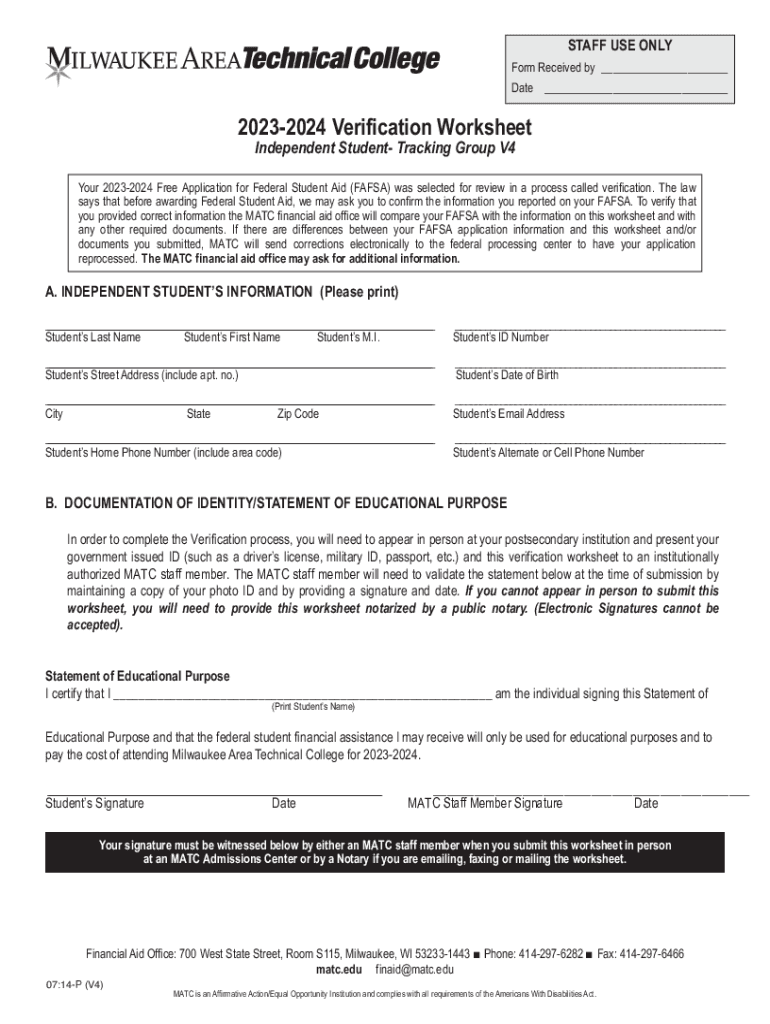 STAFF USE Uniform Received by ___Date ___20232024 Verification Worksheet Independent Student Tracking Group V4Your 20232024 Free Application for Federal Student Aid (FAFSA) was selected for review