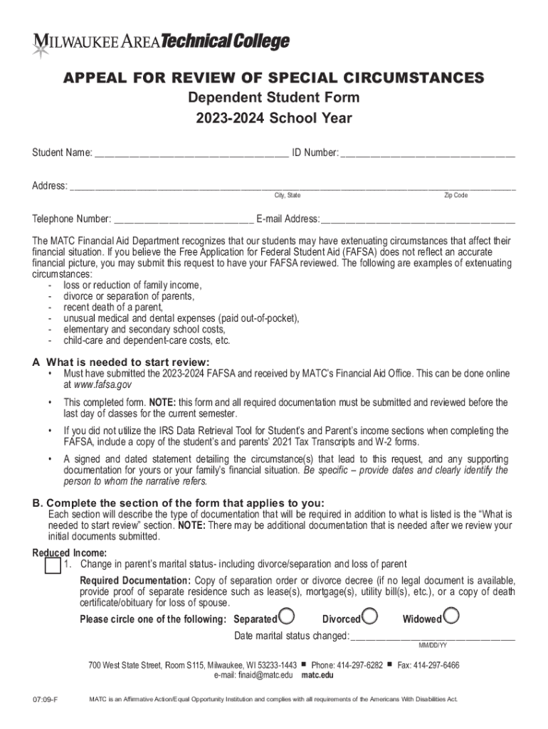 APPEAL FOR REVIEW OF SPECIAL CIRCUMSTANCES Dependent Student Form 20232024 School YearStudent Name: ___ ID Number: ___ Address: ___ City, State CodeTelephone Number: ___ Email Address:___The MATCH