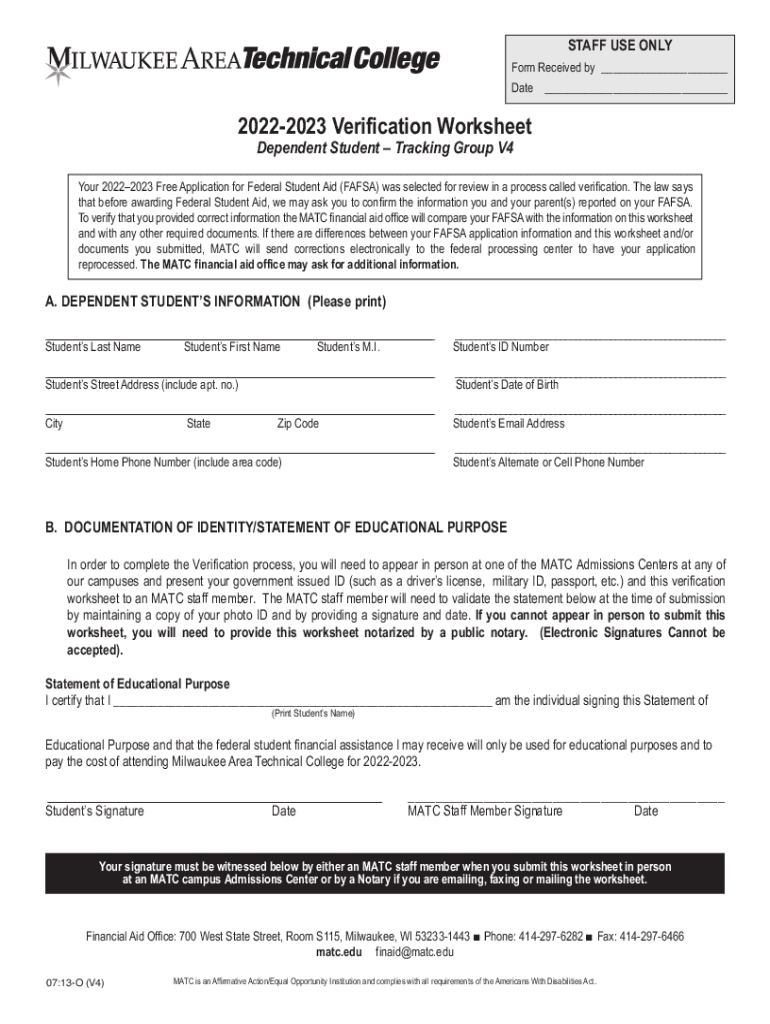 STAFF USE Uniform Received by ___Date ___20222023 Verification Worksheet Dependent Student Tracking Group V4Your 20222023 Free Application for Federal Student Aid (FAFSA) was selected for review in