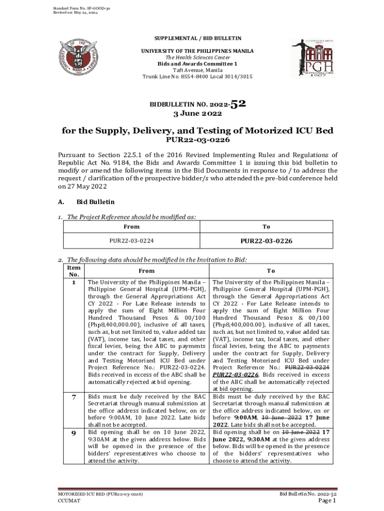 Standard Form No. SFGOOD30 Revised on: May 24, 2004SUPPLEMENTAL / BID BULLETIN UNIVERSITY OF THE PHILIPPINES MANILA The Health Sciences Center Bids and Awards Committee 1 Taft Avenue, Manila Trunk