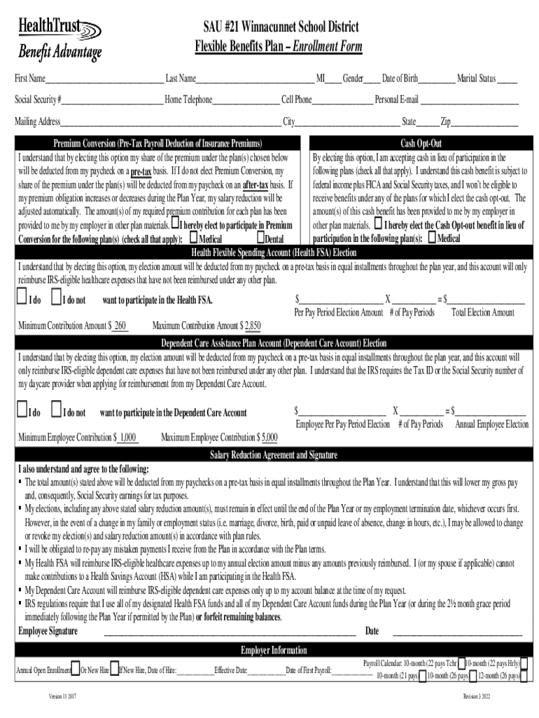 SAU #21 Winnacunnet School District Flexible Benefits Plan Enrollment Form First Name___ Last Name___ MI___ Gender___ Date of Birth___ Marital Status ___ Social Security #___ Home Telephone___ Cell