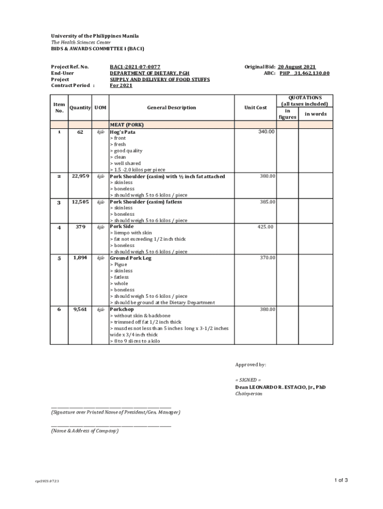 University of the Philippines Manila The Health Sciences Center BIDS & AWARDS COMMITTEE I (BAC I)Project Ref. No. Endured Project Contract Period :BAC12021070077 DEPARTMENT OF DIETARY, pH SUPPLY AND