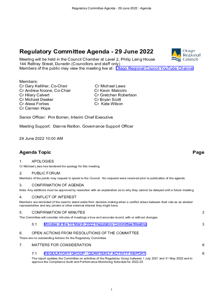 Regulatory Committee Agenda 29 June 2022 AgendaRegulatory Committee Agenda 29 June 2022 Meeting will be held in the Council Chamber at Level 2, Philip Lying House 144 Rattrap Street, Dunedin (Councillors