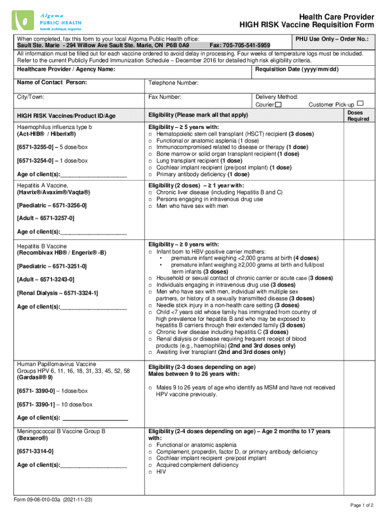 Health Care Provider HIGH RISK Vaccine Requisition Form PhD Use Only Order No.: When completed, fax this form to your local Alma Public Health office: Salt Ste. Marie 294 Willow Ave Salt Ste. Marie,