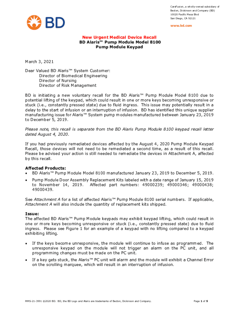 Get the free New Urgent Medical Device Recall BD Alaris Pump ...