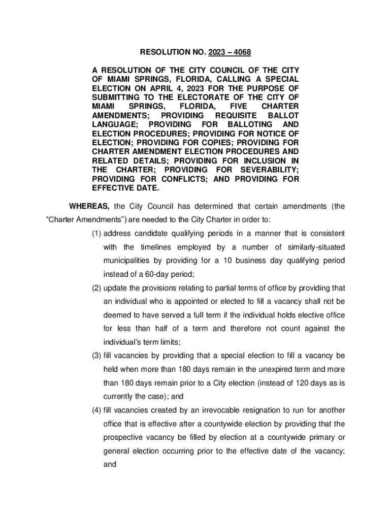 RESOLUTION NO. 2023 4068 A RESOLUTION OF THE CITY COUNCIL OF THE CITY OF MIAMI SPRINGS, FLORIDA, CALLING A SPECIAL ELECTION ON APRIL 4, 2023, FOR THE PURPOSE OF SUBMITTING TO THE ELECTORATE OF THE