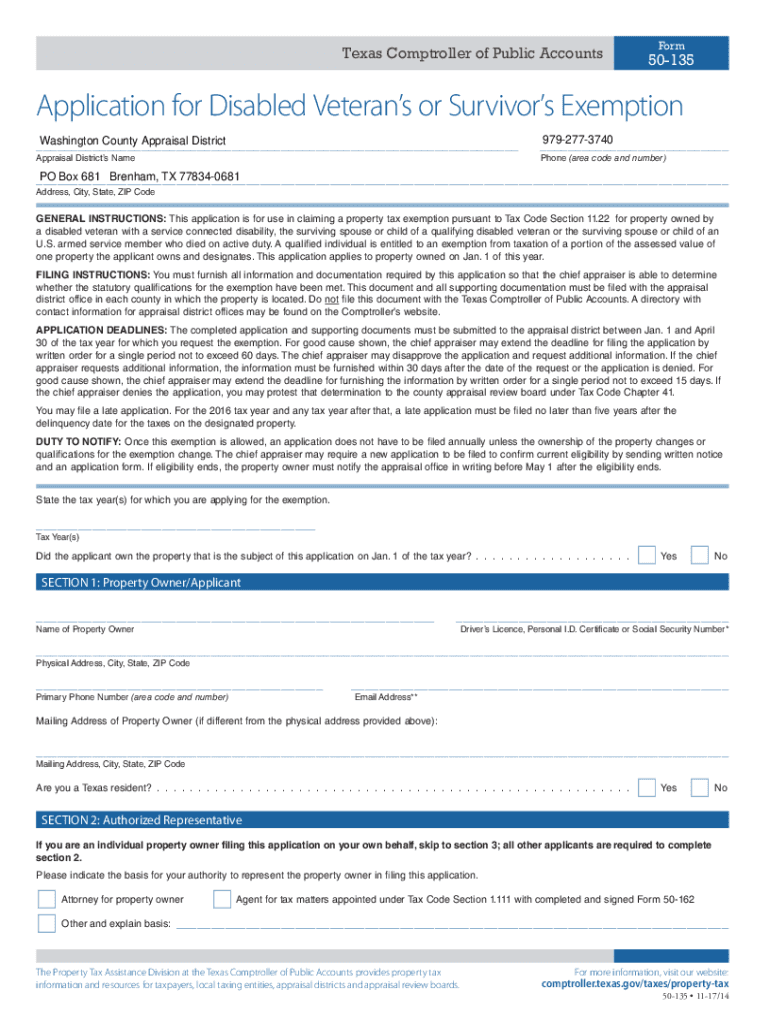 Texas Comptroller of Public AccountsForm50135Application for Disabled Veterans or Survivors Exemption 9792773740 Washington County Appraisal District ______ Appraisal Districts Telephone (area code
