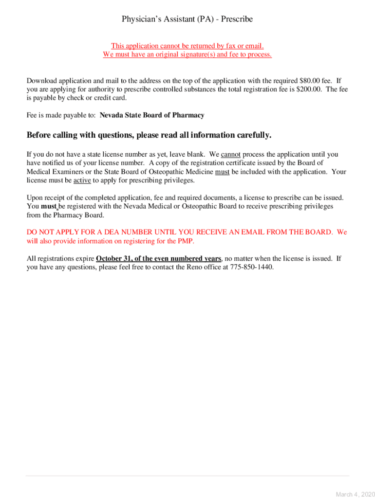 Physicians Assistant (PA) Prescribe This application cannot be returned by fax or email. We must have an original signature(s) and fee to process. Download application and mail to the address on the