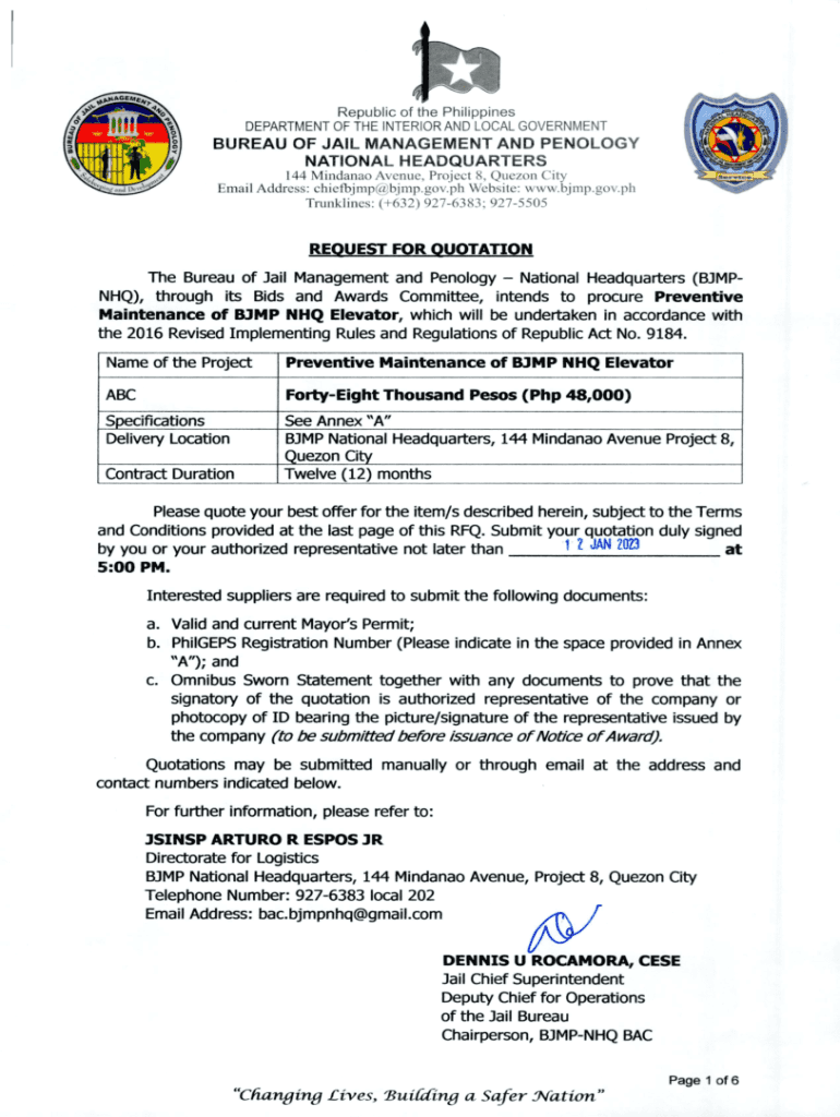 Republic of the Philippines DEPARTMENT OF THE INTERIOR AND LOCAL GOVERNMENTBUREAU OF JAIL MANAGEMENT AND PENOLOGY NATIONAL HEADQUARTERS 144 Mindanao Avenue, Project 8, Quezon City Email Address: chiefbjmp@bjnip.gov.ph