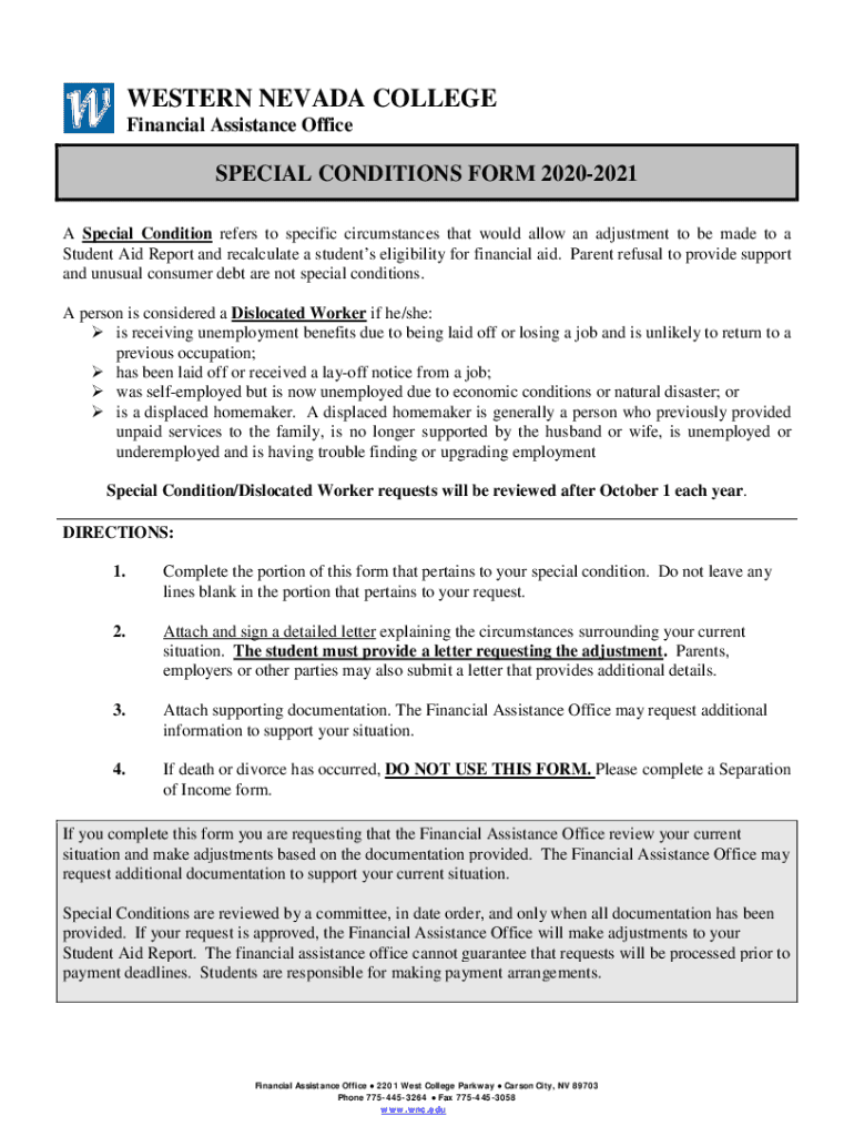 WESTERN NEVADA COLLEGE Financial Assistance OfficeSPECIAL CONDITIONS FORM 20202021 A Special Condition refers to specific circumstances that would allow an adjustment to be made to a Student Aid Report