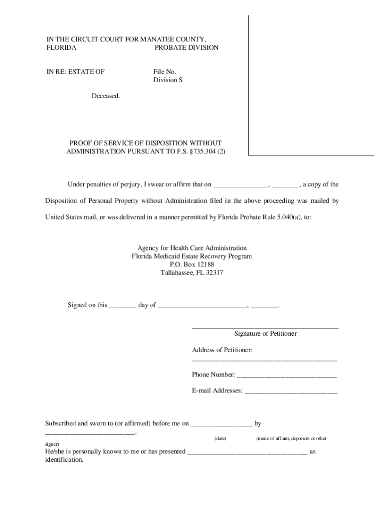 IN THE CIRCUIT COURT FOR MANATEE COUNTY, FLORIDA PROBATE DIVISION IN RE: ESTATE Office No. Division Deceased. PROOF OF SERVICE OF DISPOSITION WITHOUT ADMINISTRATION PURSUANT TO F.S. 735.304 (2)Under