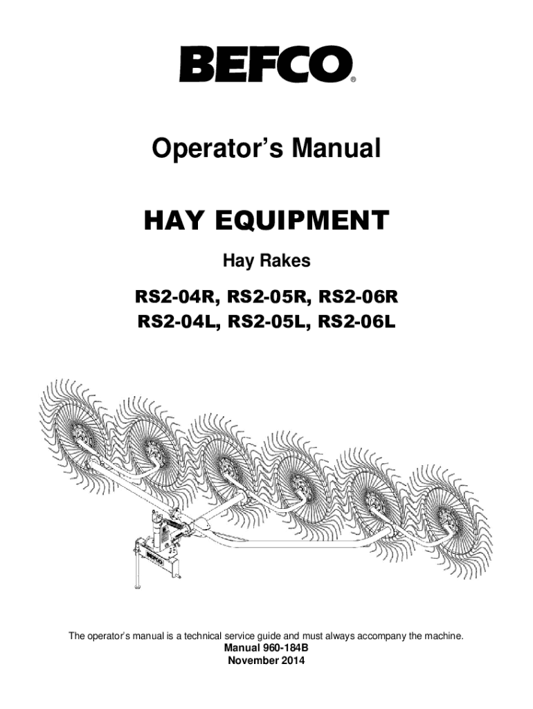 Cooperators Manual HAY EQUIPMENT Hay Rakes RS204R, RS205R, RS206R RS204L, RS205L, RS206LThe operators manual is a technical service guide and must always accompany the machine. Manual 960184B November