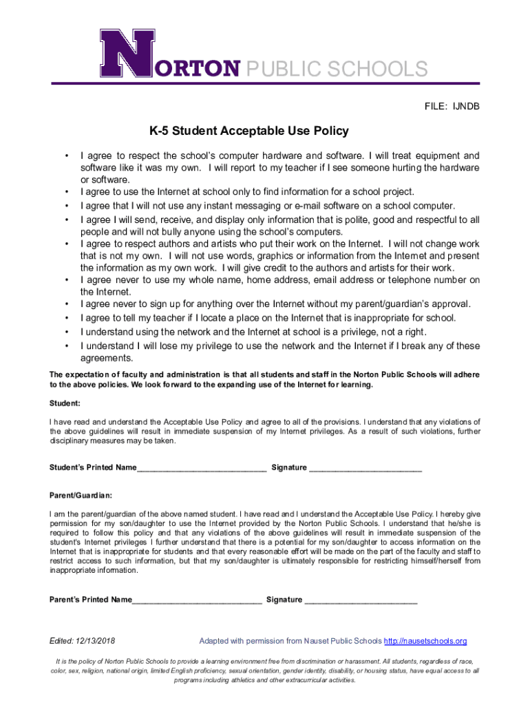 NORTON PUBLIC SCHOOLS FILE: IJNDBK5 Student Acceptable Use Policy I agree to respect the schools' computer hardware and software. I will treat equipment and software like it was my own. I will report