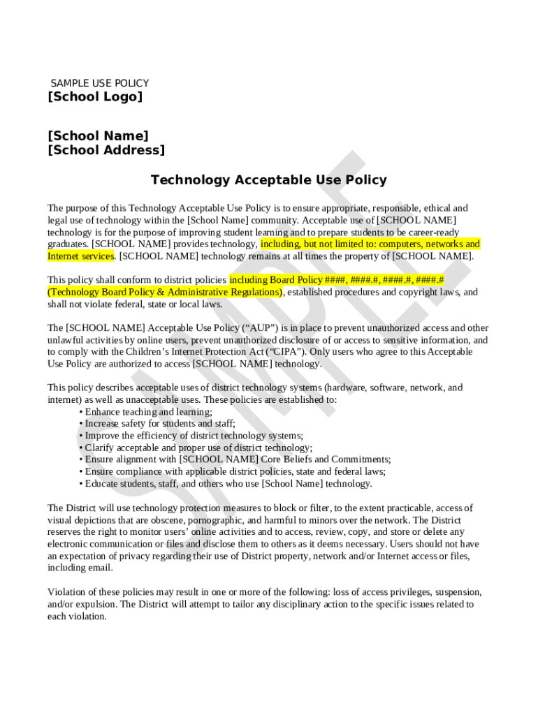 The Page 1 Responsible Use of School Technology for University ... is a document you can get completed and signed for specific purpose. In that case, it is furnished to the actual addressee in order to provide specific information of certain kinds. The completion and signing may be done in hard copy or with a trusted solution e. g. PDFfiller. Such tools help to complete any PDF or Word file without printing them out. While doing that, you can customize its appearance according to your requirements and put an official legal e-signature. Once done, the user ought to send the Page 1 Responsible Use of School Technology for University ... to the recipient or several of them by email and also fax. PDFfiller offers a feature and options that make your Word template printable. It provides various options when printing out appearance. It doesn't matter how you'll file a form - in hard copy or by email - it will always look neat and clear. In order not to create a new editable template from the beginning every time, make the original Word file into a template. Later, you will have an editable sample.