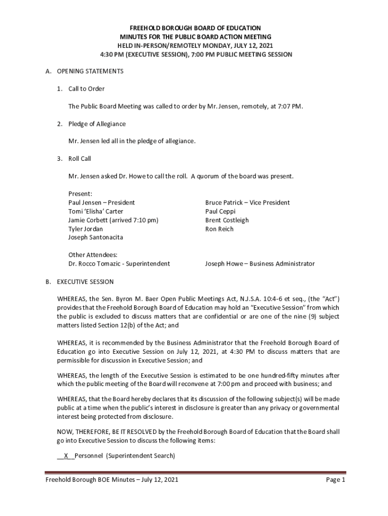 FREEHOLD BOROUGH BOARD OF EDUCATION MINUTES FOR THE PUBLIC BOARD ACTION MEETING HELD UNPERSON/REMOTELY MONDAY, JULY 12, 2021 4:30 PM (EXECUTIVE SESSION), 7:00 PM PUBLIC MEETING SESSION A. OPENING