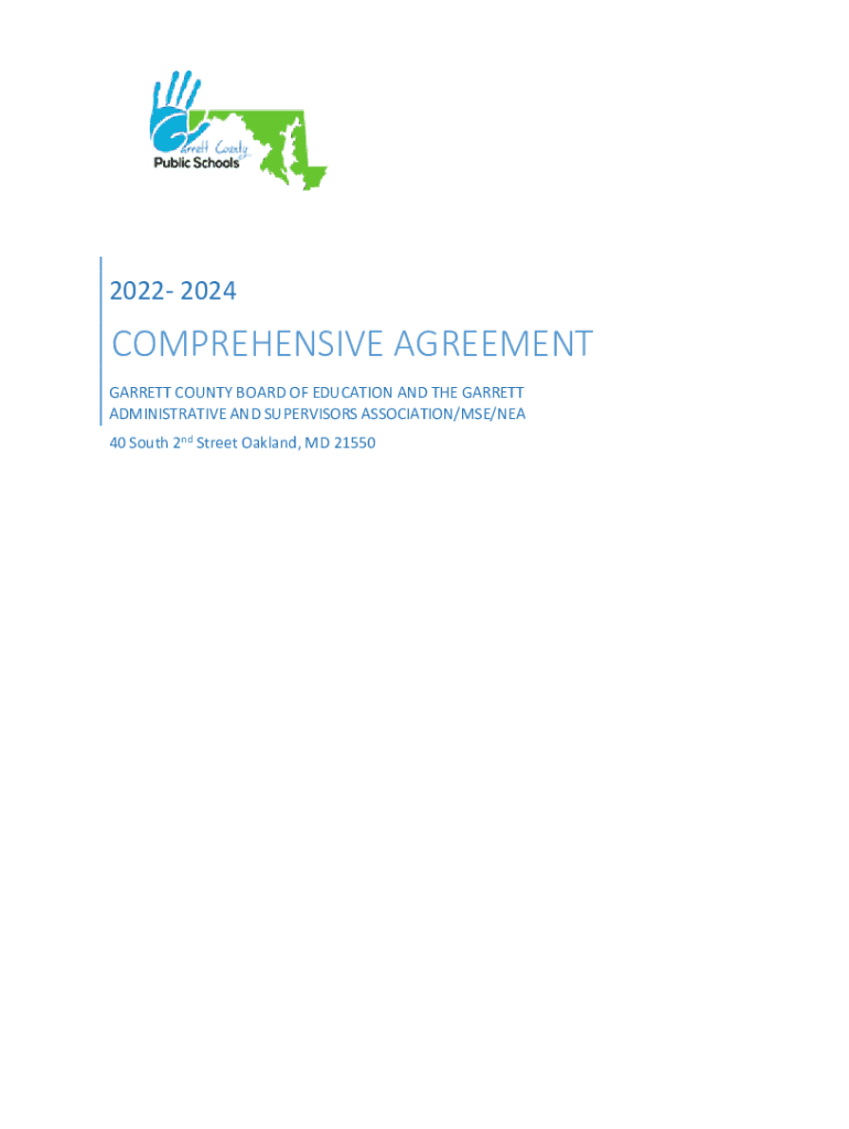 2022 2024COMPREHENSIVE AGREEMENT GARRETT COUNTY BOARD OF EDUCATION AND THE GARRETT ADMINISTRATIVE AND SUPERVISORS ASSOCIATION/MSE/NEA 40 South 2nd Street Oakland, MD 21550TABLE OF CONTENTS Page NumberARTICLE