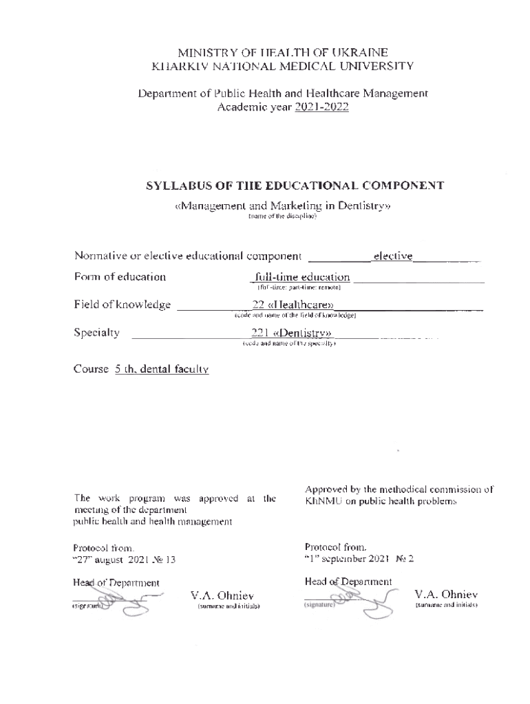 M IN IS T R Y OF H E A L T H OF U K R A IN E K H A R K IV N A T IO N A L M E D IC A L U N IV E R S IT Y D part ENT o f Public Health and Healthcare M an AG em en t A cadet icy ear 2 02 12022S Y L