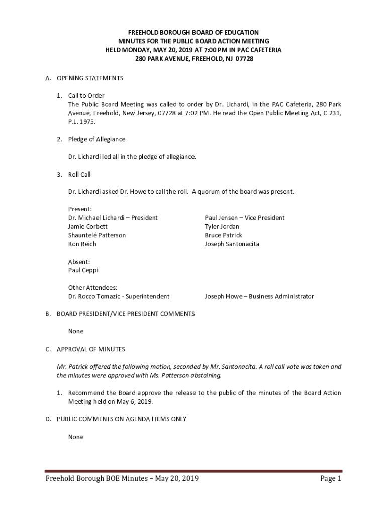 FREEHOLD BOROUGH BOARD OF EDUCATION MINUTES FOR THE PUBLIC BOARD ACTION MEETING HELD MONDAY, MAY 20, 2019, AT 7:00 PM IN PAC CAFETERIA 280 PARK AVENUE, FREEHOLD, NJ 07728 A. OPENING STATEMENTS 1.
